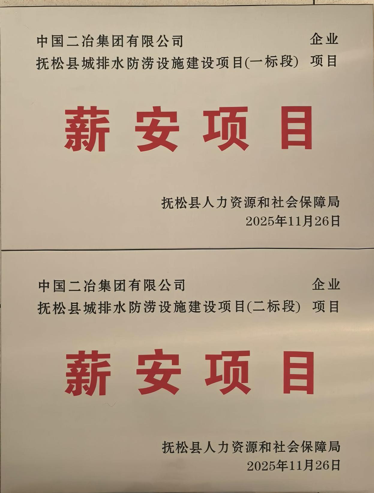 近日,撫松縣人力資源和社會保障局公布2025年度縣級“薪安項目”評選結果,中冶福建公司承建的撫松縣城排水防澇設施建設項目一標段、二標段成功入選,獲評“薪安項目”稱號。