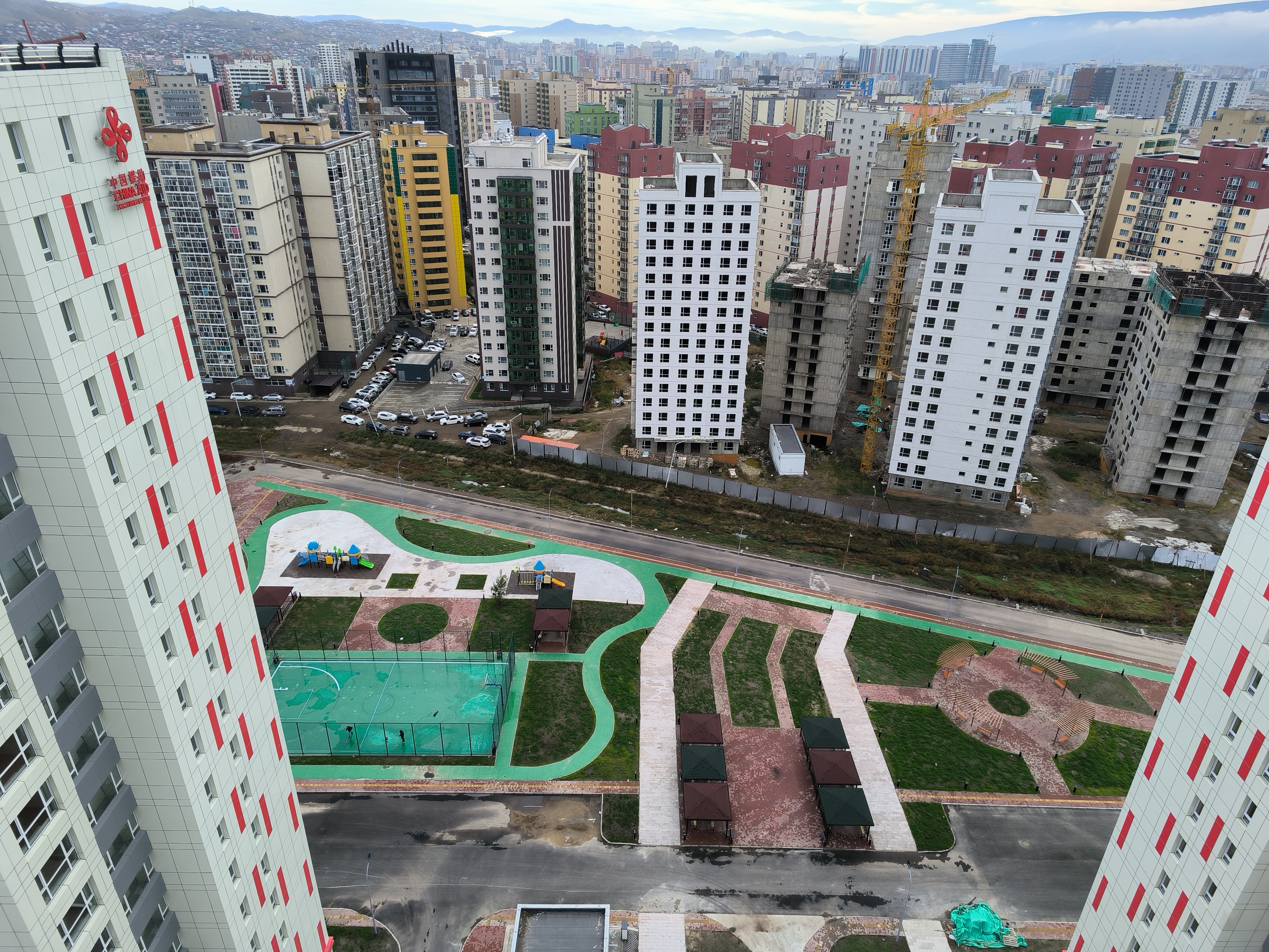 9月12日,中國(guó)二冶蒙古國(guó)棚戶區(qū)改造項(xiàng)目景觀綠化工程全面完成。