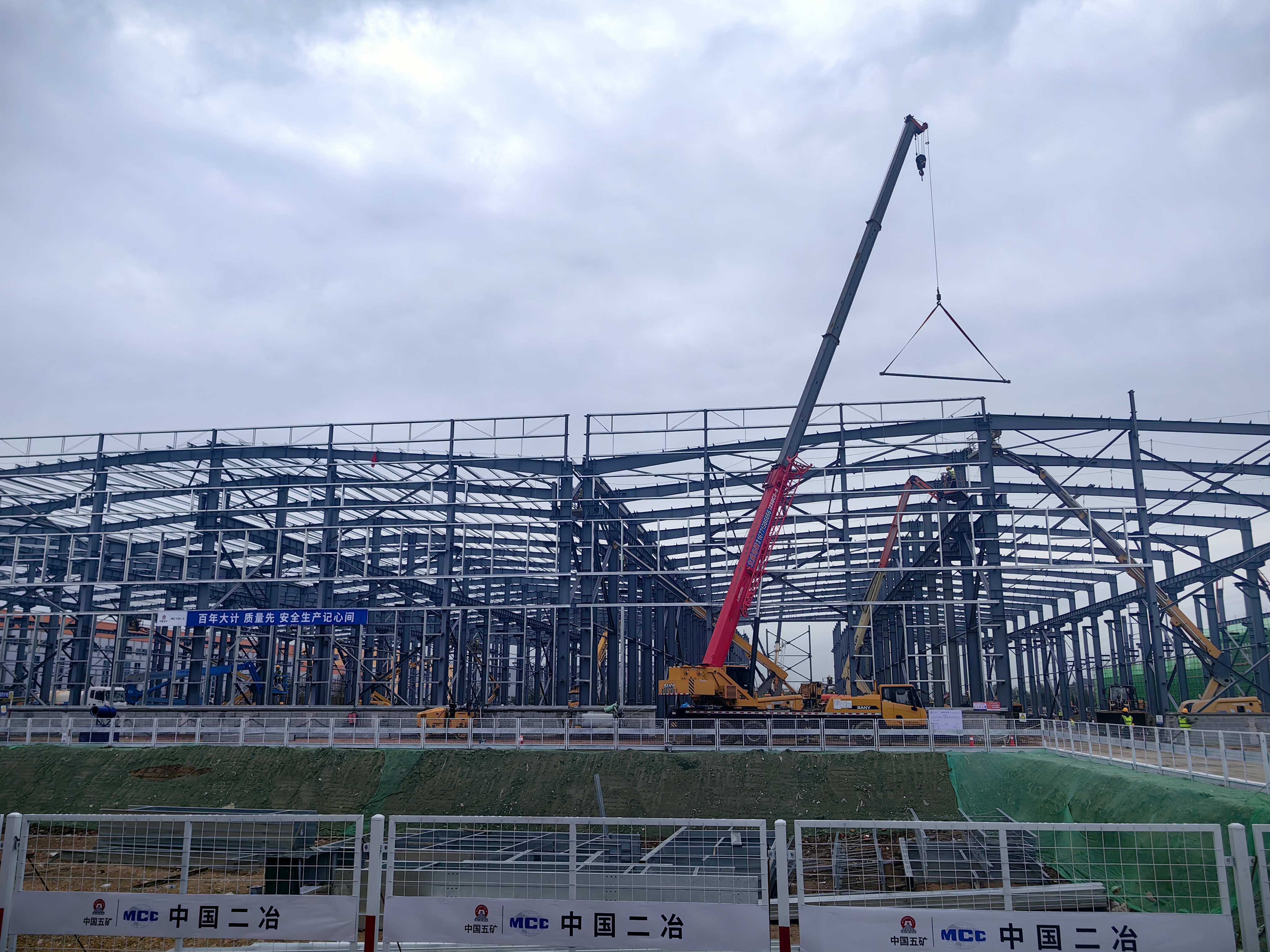 節(jié)日期間,坯料車間A~H軸鋼結(jié)構(gòu)主體鋼柱、鋼梁全部安裝挖畢,10月3日開始屋面檁條安裝。該項(xiàng)目至8月20日入場施工以來,僅用43天累計(jì)完成坯料車間土方開挖70000立方米,換填混砂15000立方米,基礎(chǔ)砼澆注3985立方米,鋼結(jié)構(gòu)安裝1400噸。目前,坯料車間主體完成55%,熔煉車間土方開完完成,基礎(chǔ)澆注完成,氫碎車間土方開挖完成。