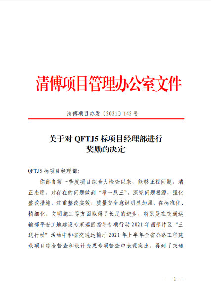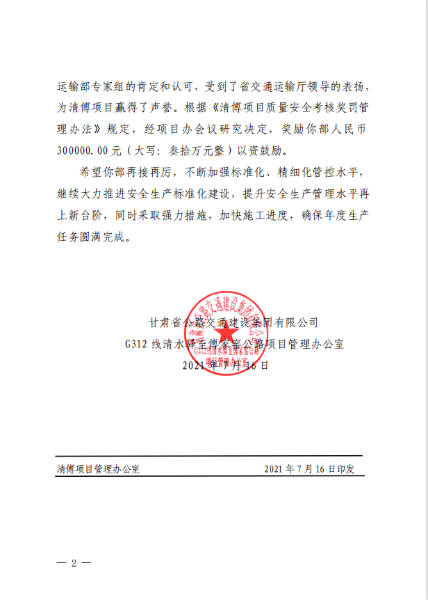 7月20日,因中國二冶集團(tuán)清傅項(xiàng)目部在交通運(yùn)輸部平安工地建設(shè)專家巡回指導(dǎo)專項(xiàng)行動 2021 年西部片區(qū)“三送行動”活動中和省交通運(yùn)輸廳 2021 年上半年全省公路工程建設(shè)項(xiàng)目綜合督查和設(shè)計變更專項(xiàng)督查中表現(xiàn)突出,獲得清傅項(xiàng)目辦獎勵人民幣30萬元。