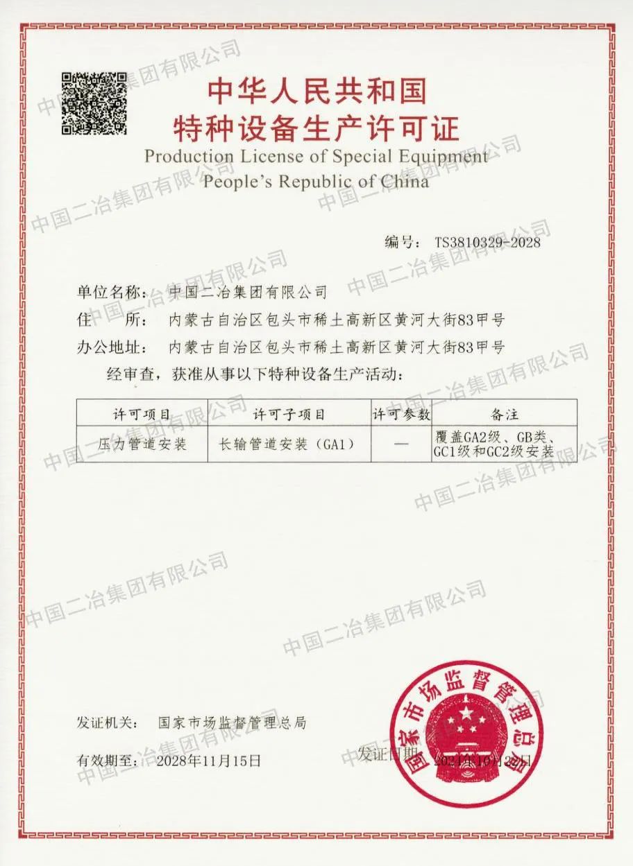 10月31日,中國二冶收到由國家市場監(jiān)督管理總局頒發(fā)的GA1級壓力管道安裝許可資質(zhì)證書,本次資質(zhì)證書于10月22日印發(fā),標(biāo)志著中國二冶順利完成壓力管道換證工作,實現(xiàn)GA、GB、GC類壓力管道安裝系列資質(zhì)全覆蓋,為公司長輸管道安裝提供了重要的資質(zhì)保障。