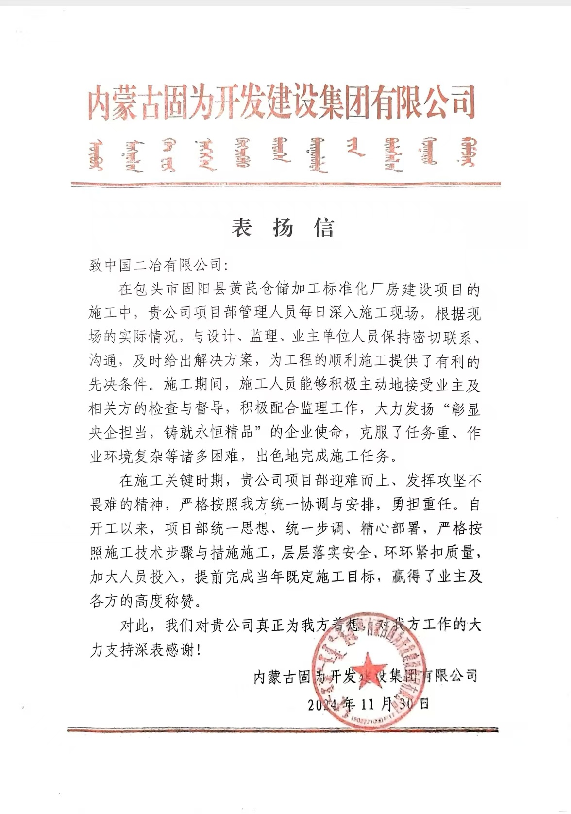 12月2日,中國二冶收到內蒙古固為開發(fā)建設集團有限公司發(fā)來的第二封表揚信,高度稱贊項目管理團隊提前完成固陽縣黃芪倉儲加工標準化廠房建設項目既定目標的杰出表現。