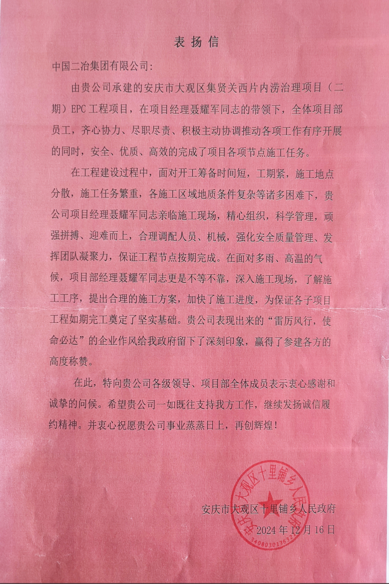 近日,安慶市大觀區(qū)十里鋪鄉(xiāng)人民政府和安慶市觀江水務(wù)有限責(zé)任公司給中國二冶發(fā)來表揚(yáng)信,對(duì)安慶市大觀區(qū)集賢關(guān)西片內(nèi)澇治理項(xiàng)目(二期)高質(zhì)量、高標(biāo)準(zhǔn)完成施工任務(wù)給予高度贊揚(yáng)。