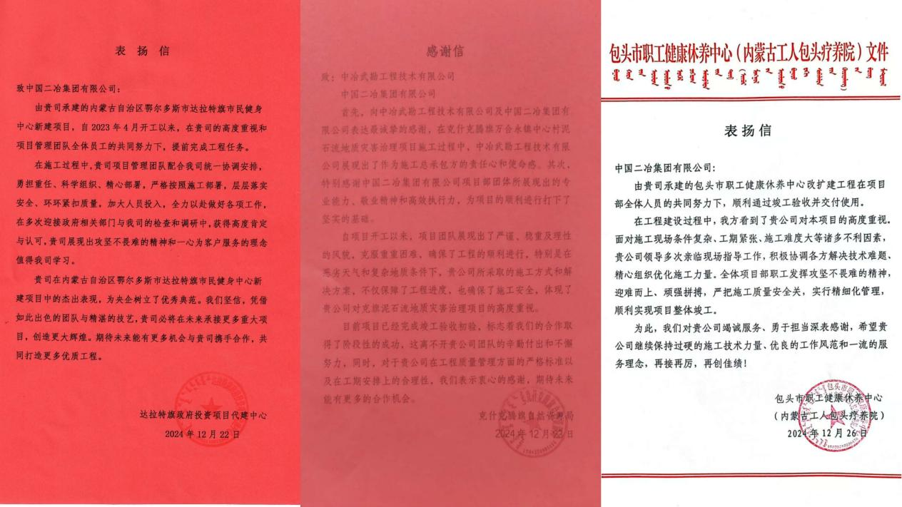 近日,中國二冶先后收到來自達(dá)拉特旗政府投資項(xiàng)目代建中心、克什克騰旗自然資源局以及包頭市職工健康休養(yǎng)中心的三封表揚(yáng)信。信中高度贊揚(yáng)了中國二冶在達(dá)旗健民中心項(xiàng)目、赤峰泥石流項(xiàng)目、包頭康養(yǎng)項(xiàng)目建設(shè)中展現(xiàn)出的卓越專業(yè)能力、嚴(yán)謹(jǐn)施工態(tài)度以及為地方經(jīng)濟(jì)社會發(fā)展作出的積極貢獻(xiàn)。