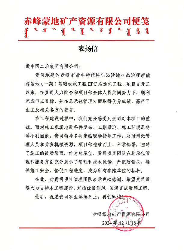 赤峰蒙地礦產資源有限公司在信中表示,赤峰翁牛特科爾沁沙地治理項目自開工建設以來,面對諸多不利因素,項目建設團隊主動作為,精心策劃、合理安排,在施工管理過程中對施工質量嚴格把關,最終安全優(yōu)質完成項目節(jié)點目標,樹立了央企典范。