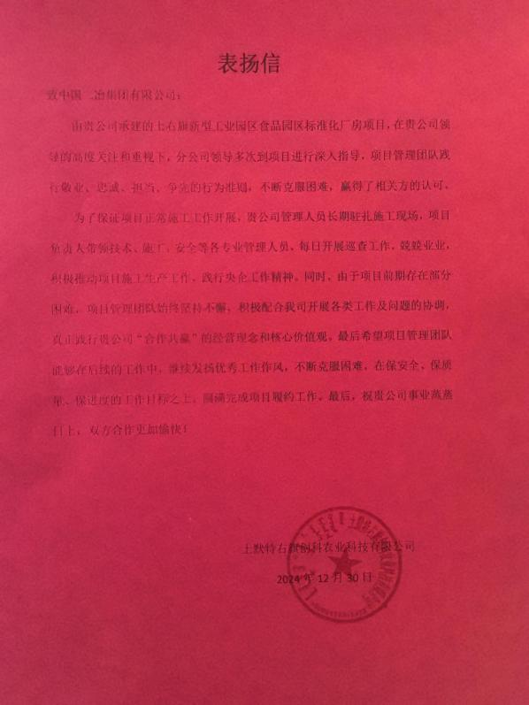 土默特右旗創(chuàng)科農業(yè)科技有限公司在信中表示,土右旗食品園區(qū)標準化廠房項目團隊面對各種挑戰(zhàn)和復雜情況,始終能夠從全局出發(fā),冷靜應對、及時調整,穩(wěn)步推進施工進度,高效開展工程建設任務,順利完成節(jié)點目標,以實際行動彰顯了專業(yè)能力和責任擔當。