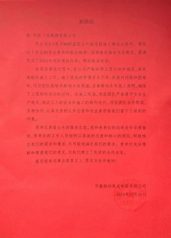 華鑫微納集成電路有限公司在信中表示,8英寸MEMS晶圓生產線項目建設團隊精心編制策劃與方案、嚴格按照工程計劃和規(guī)范,高效組織各項施工工作,?始終保持著高度的責任感和使命感,?以精湛的技術、?嚴謹?shù)膽B(tài)度和飽滿的干勁確保了工程的順利推進。