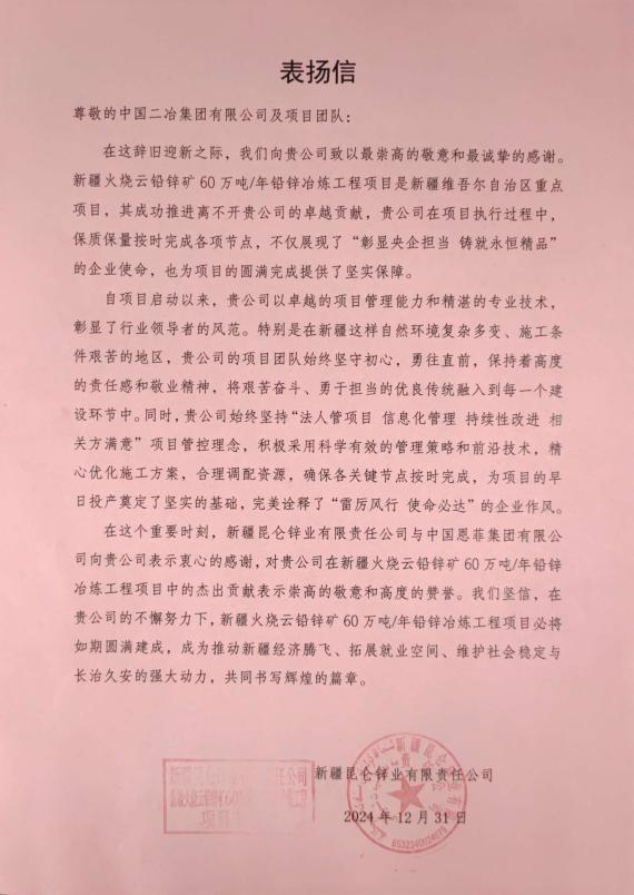 新疆昆侖鋅業(yè)有限責任公司在信中表示,自項目啟動以來,新疆火燒云鉛鋅礦60萬噸/年鉛鋅冶煉工程項目以卓越的項目管理能力和精湛的專業(yè)技術,彰顯了行業(yè)領導者的風范。特別是在面對自然環(huán)境復雜多變、施工條件艱苦的挑戰(zhàn),項目團隊始終堅守初心,勇往直前,保持高度的責任感和敬業(yè)精神,為項目的早日投產奠定堅實的基礎。