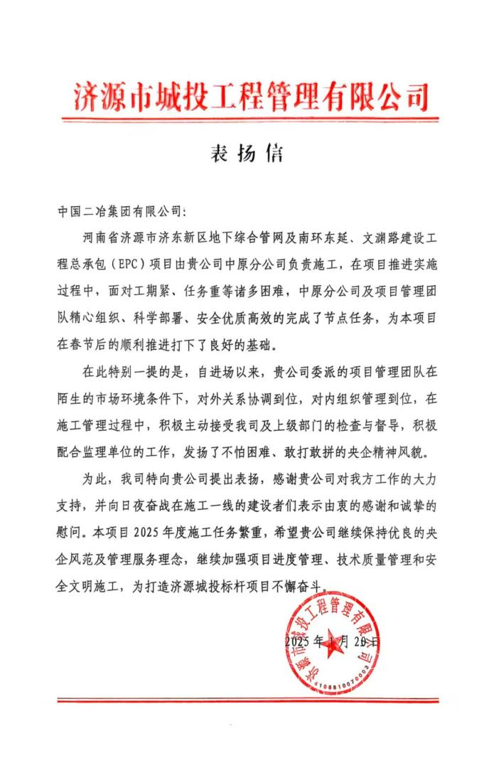 濟(jì)源市城投工程管理有限公司在信中表示,自進(jìn)場以來,面對工期緊、任務(wù)重、環(huán)境復(fù)雜等諸多困難,中國二冶項(xiàng)目管理團(tuán)隊(duì)精心組織、周密安排、科學(xué)部署,優(yōu)質(zhì)高效地完成了多項(xiàng)節(jié)點(diǎn)任務(wù),積極主動接受上級部門的檢查與督導(dǎo),發(fā)揚(yáng)了不怕困難、敢打敢拼的央企精神。
