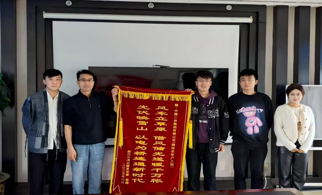 錦旗上題寫“風(fēng)車立草原,借風(fēng)儲(chǔ)光送暖千萬(wàn)帳;光伏映雪山,以電為橋連通新時(shí)代”,生動(dòng)詮釋了項(xiàng)目的核心價(jià)值與深遠(yuǎn)意義。新巴爾虎左旗政府表示,該項(xiàng)目地處內(nèi)蒙古偏遠(yuǎn)牧區(qū),氣候條件惡劣、交通出行不便,整體施工環(huán)境極為艱苦。面對(duì)挑戰(zhàn),項(xiàng)目管理團(tuán)隊(duì)充分發(fā)揮技術(shù)與管理優(yōu)勢(shì),始終以“高標(biāo)準(zhǔn)、高質(zhì)量、高效率”為施工準(zhǔn)則,全力克服物資運(yùn)輸困難、極端天氣影響等多重難題,最終如期完成節(jié)點(diǎn)任務(wù)。該項(xiàng)目的順利推進(jìn),不僅成功解決了當(dāng)?shù)剞r(nóng)牧民的急難愁盼問(wèn)題,直接惠及數(shù)百戶農(nóng)牧民家庭,顯著提升了牧區(qū)群眾的生活品質(zhì);更通過(guò)產(chǎn)業(yè)配套升級(jí),為當(dāng)?shù)亟?jīng)濟(jì)可持續(xù)發(fā)展注入了新動(dòng)能,為邊疆牧區(qū)發(fā)展奠定了堅(jiān)實(shí)基礎(chǔ)。