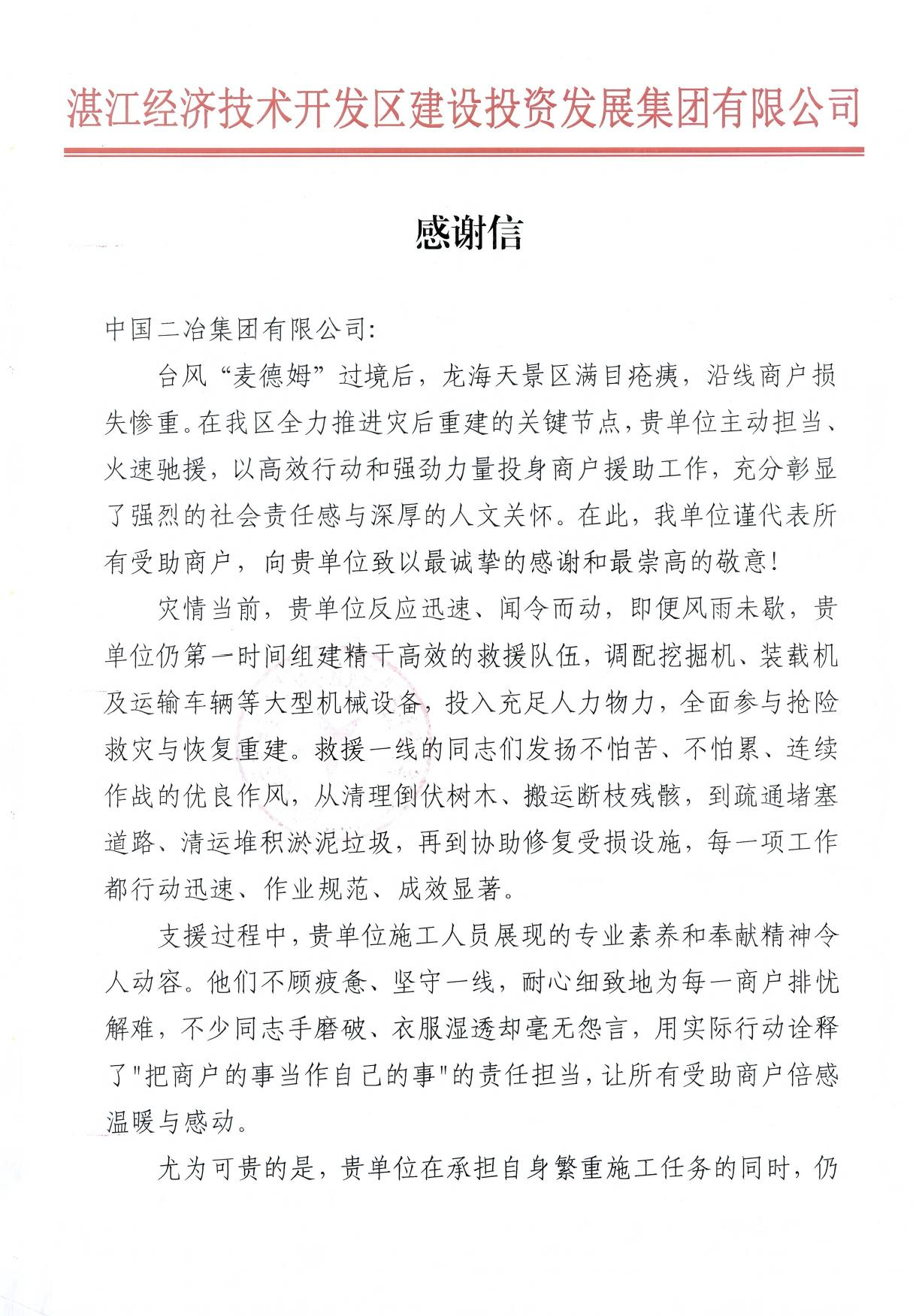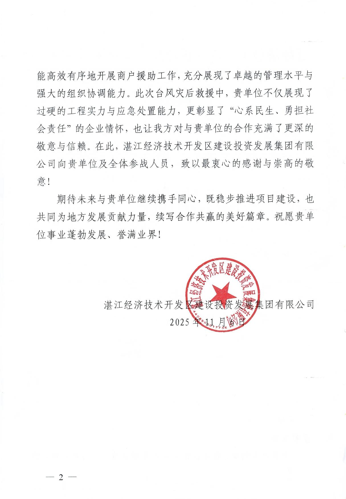 表揚(yáng)信指出,臺風(fēng)“麥德姆”給龍海天景區(qū)及沿線商戶造成嚴(yán)重?fù)p失,災(zāi)后重建工作迫在眉睫。關(guān)鍵時刻,中國二冶主動請纓、迅速響應(yīng),在風(fēng)雨未歇之際組建精干救援隊伍,調(diào)配挖掘機(jī)、裝載機(jī)等大型機(jī)械設(shè)備,投入充足人力全力參與搶險。救援人員發(fā)揚(yáng)連續(xù)作戰(zhàn)的優(yōu)良作風(fēng),高效開展倒伏樹木清理、斷枝搬運(yùn)、道路疏通、淤泥清運(yùn)及受損設(shè)施修復(fù)等工作,作業(yè)規(guī)范、成效顯著。施工人員不顧疲憊與辛勞,耐心為商戶排憂解難,部分人員手磨破、衣服濕透仍毫無怨言,用實(shí)際行動詮釋了“把商戶的事當(dāng)作自己的事”的責(zé)任擔(dān)當(dāng),讓受助商戶倍感溫暖。表揚(yáng)信特別提到,中國二冶在承擔(dān)自身繁重施工任務(wù)的同時,仍能高效有序推進(jìn)援助工作,充分展現(xiàn)了卓越的管理水平、強(qiáng)大的組織協(xié)調(diào)能力及過硬的應(yīng)急處置實(shí)力。