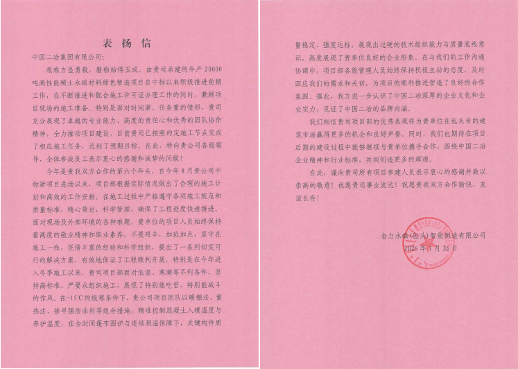 表?yè)P(yáng)信字里行間的肯定,匯聚成勇毅前行的底氣;聲聲入耳的贊譽(yù),凝結(jié)為高效履約的不竭動(dòng)力。新的一年,項(xiàng)目部表示要以匠心堅(jiān)守履約承諾,以品質(zhì)鑄就口碑根基,全力推進(jìn)項(xiàng)目?jī)?yōu)質(zhì)履約,用實(shí)際行動(dòng)擦亮稀土領(lǐng)域品牌,為包頭市經(jīng)濟(jì)建設(shè)貢獻(xiàn)二冶力量。