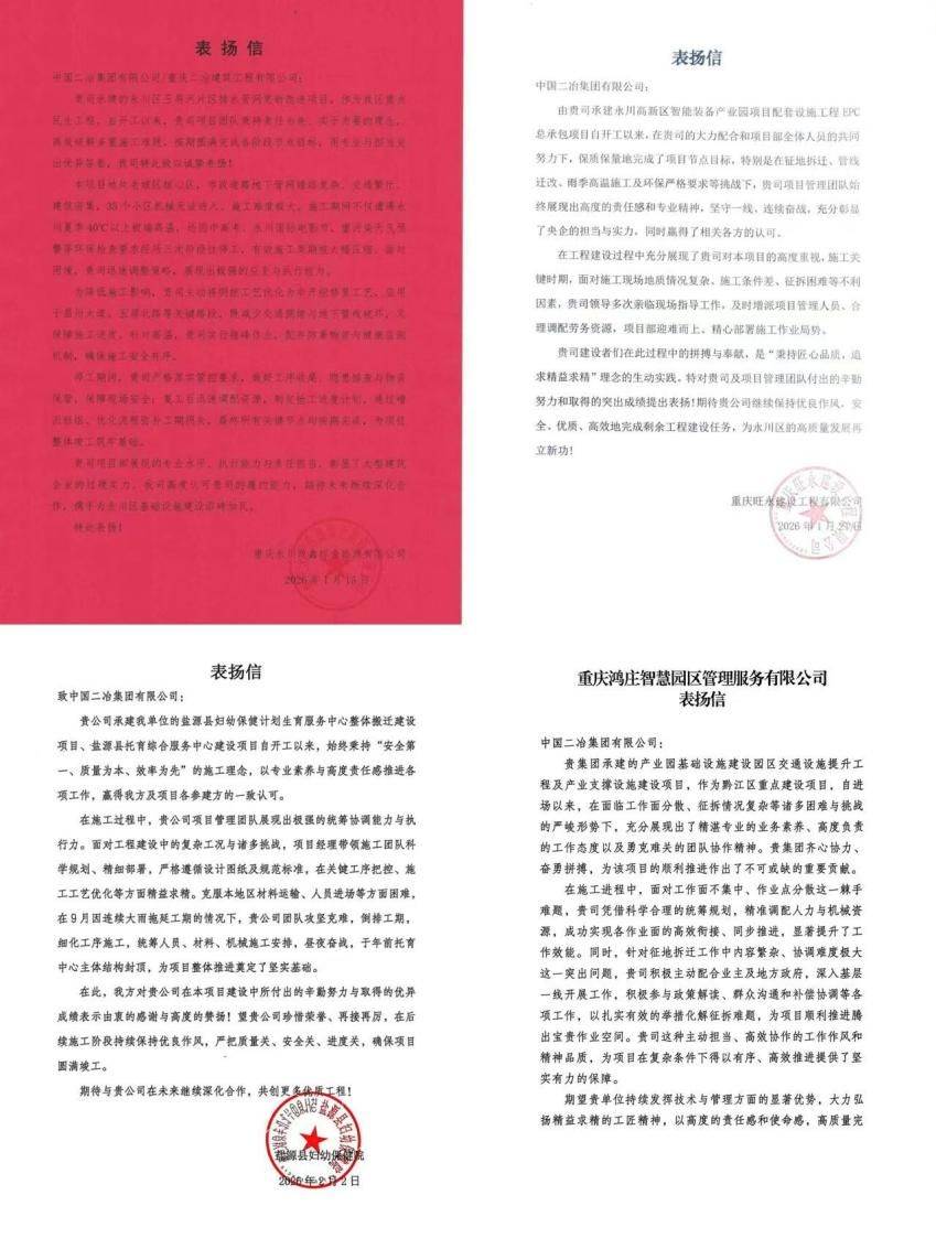 重慶鴻莊智慧園區(qū)管理服務(wù)有限公司在信中指出,中國(guó)二冶承建的產(chǎn)業(yè)園基礎(chǔ)設(shè)施建設(shè)園區(qū)交通設(shè)施提升工程及產(chǎn)業(yè)支撐設(shè)施建設(shè)項(xiàng)目,作為黔江區(qū)重點(diǎn)建設(shè)項(xiàng)目,自進(jìn)場(chǎng)以來(lái),雖面臨工作面分散、征拆情況復(fù)雜等諸多困難與挑戰(zhàn),但中國(guó)二冶仍充分彰顯了專(zhuān)業(yè)精湛的業(yè)務(wù)素養(yǎng)、高度負(fù)責(zé)的工作態(tài)度以及攻堅(jiān)克難的團(tuán)隊(duì)協(xié)作精神。