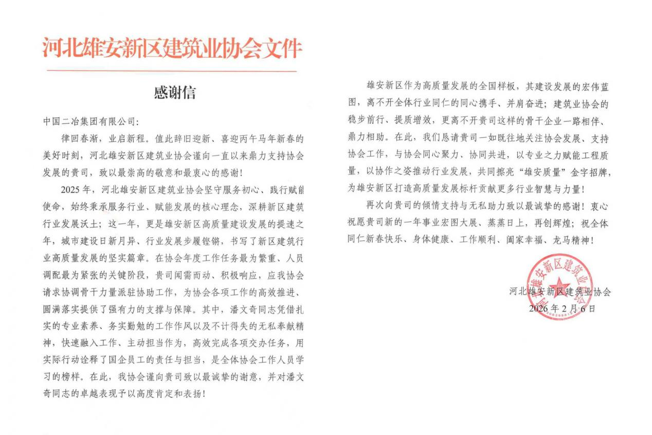 感謝信指出,中國二冶始終堅守初心、履職盡責,在項目建設中搶工期、保質(zhì)量、守安全、促環(huán)保,不僅高效推進各項工程節(jié)點順利落地,更積極參與新區(qū)工程建設行業(yè)交流,主動分享建設經(jīng)驗,助力提升區(qū)域建筑業(yè)整體發(fā)展水平,為雄安新區(qū)大規(guī)模建設與高質(zhì)量發(fā)展注入了強勁動力,用實際行動生動詮釋了央企的責任與擔當。