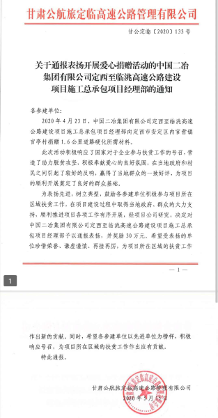 5月18日,根據(jù)甘肅公航旅定臨高速公路管理有限公司(甘公定臨〔2020〕133)號文件獲悉,定臨高速項(xiàng)目為定西市安定區(qū)內(nèi)官營鎮(zhèn)官亭村捐贈(zèng)1.6公里道路硬化所需材料受表揚(yáng)。