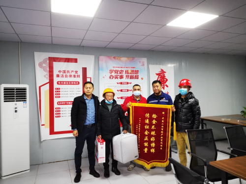 “感謝央企培養(yǎng)出這么好的員工!要不是你們拾金不昧、認(rèn)真負(fù)責(zé),那我們欄目損失可就大了!中國(guó)二冶好樣的,不愧是央企!這次失而復(fù)得,使我真切感受到中國(guó)二冶作為央企的責(zé)任擔(dān)當(dāng)。”隨后,欄目組工作人員將一面印著“拾金不昧好榜樣,傳遞社會(huì)正能量”的錦旗送到項(xiàng)目負(fù)責(zé)人手中,并要給項(xiàng)目部一些酬謝,項(xiàng)目負(fù)責(zé)人婉言拒絕。
