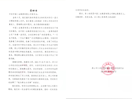 10月29日,中國(guó)二冶收到一封來自眉山市仁壽縣高家鎮(zhèn)石青村村民委員會(huì)的感謝信。