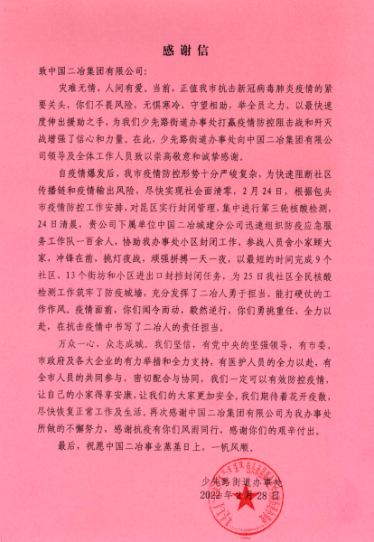 2月28日,包頭市昆區(qū)少先路街道辦事處致中國二冶感謝信,表揚中國二冶在抗擊新冠病毒肺炎疫情的緊要關(guān)頭,不畏艱險,無懼寒冷,齊心協(xié)力,共抗疫情,展現(xiàn)了中國二冶愛民為民、守土盡責、扛鼎重擔、召之必來,來之必戰(zhàn)的擔當與奉獻,特向中國二冶干部職工致以崇高敬意和衷心感謝!