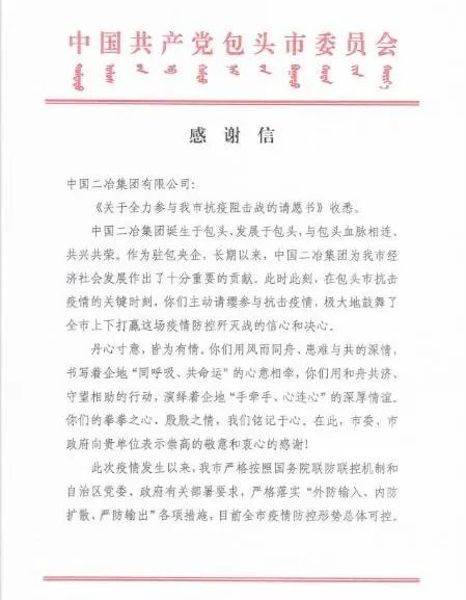 中國二冶收到包頭市委市政府感謝信
