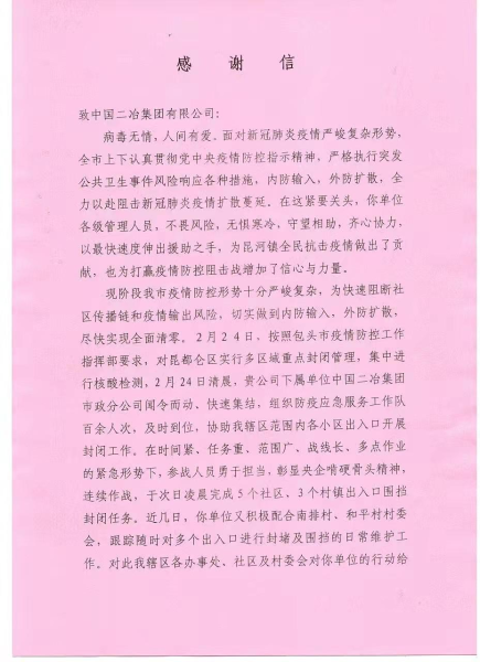 3月2日,昆河鎮(zhèn)人民政府向中國(guó)二冶發(fā)來感謝信,對(duì)中國(guó)二冶在全市全力阻擊新冠肺炎疫情擴(kuò)散蔓延的緊要關(guān)頭,不畏風(fēng)險(xiǎn),無懼寒冷,守望相助,齊心協(xié)力,以最快速度為昆河鎮(zhèn)快速阻斷社區(qū)傳播鏈和疫情輸出風(fēng)險(xiǎn)所做出的貢獻(xiàn),對(duì)央企快速反應(yīng)、雷厲風(fēng)行的工作作風(fēng)表示感謝。